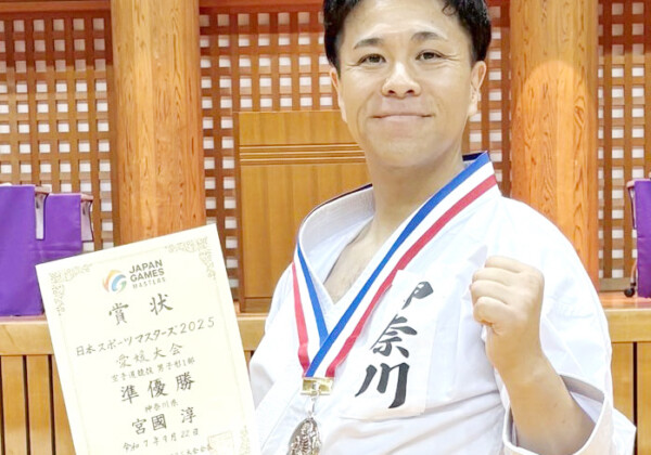 伊良部出身で神奈川県在住の空手家・宮國淳さん(46)が、9月20~22日まで愛媛県武道館で行われた日本スポーツマスターズ2025愛媛大会空手道競技男子形1部に出場し、準優勝の快挙を成し遂げた。3