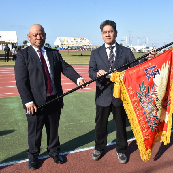 宮古地区小学校体育連盟(與那覇正人会長)は、24日に行った第44回全宮古小学校駅伝競走大会から「男女別レース」を取り入れた。これに伴い漲水整備(平良勇樹代表)が女子の優勝旗を寄贈。贈呈式では連盟関係者が見守るなか平良代表が與那覇会長に手渡した。