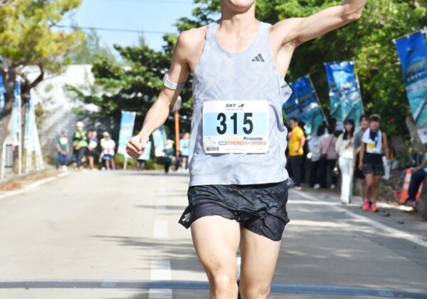 9日午前9時に市陸上競技場で号砲の宮古島大学駅伝「ワイドー・ズミ2025」に出場する順天堂大学駅伝部は合宿のため5日、宮古空港に到着し、市陸上競技協会の伊志嶺秀行副会長らが出迎えた。