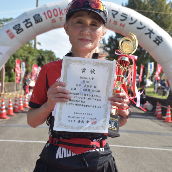 100キロ女子の部は高井美奈子さん(59)=千葉県=が2年ぶり3度目の優勝を果たした。レースは「暑さと橋の向かい風がきつかった。辛くてふらふらだったがなんとかゴールすることができた」と振り返り、3度目の優勝には笑顔を見せた。