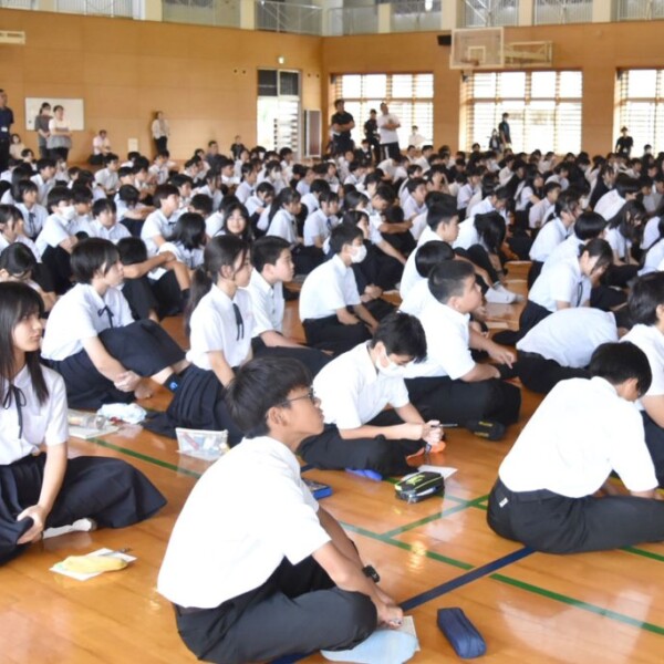 平良中学校は14日、同校体育館で未来講話を開き、沖縄科学技術大学院大学(OIST)研究員の来間清人さんが「未来を切り拓く君たちへ~地元から世界へ、研究者としての挑戦~」と題して話した。