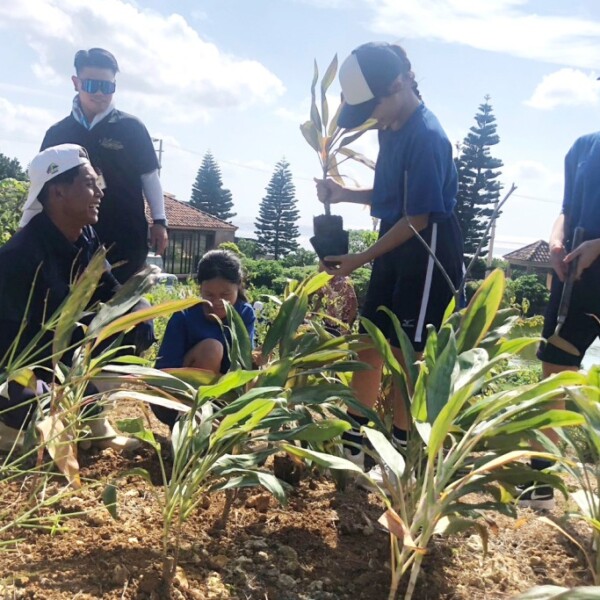 南西楽園リゾートは4日、シギラミラージュホテルのビーチフロント付近で上野中学校と協力して植樹活動を行った。