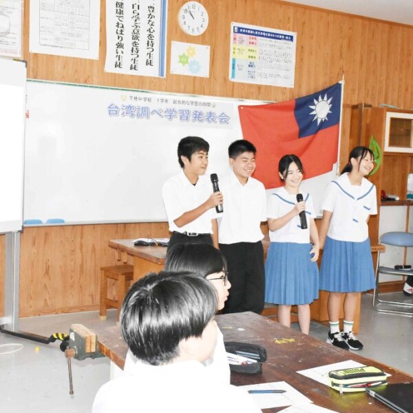 下地中学校は14日、台湾交流事業を系統的に進めるねらいで1年の総合的な学習の時間で「台湾調べ学習」の成果発表会を行った。