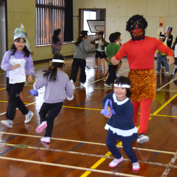鬼は外、福は内 西辺小で節分の豆まき 最後は「うまい棒」で恵方祈願