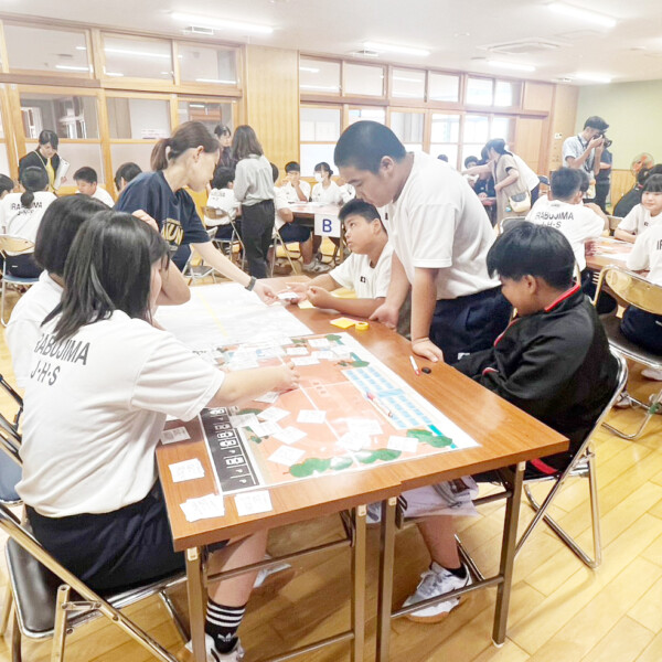 伊良部島小中学校の7年生は1日、多目的室で災害時の避難所運営を模擬体験する「HUG(避難所運営ゲーム)」を実施した。