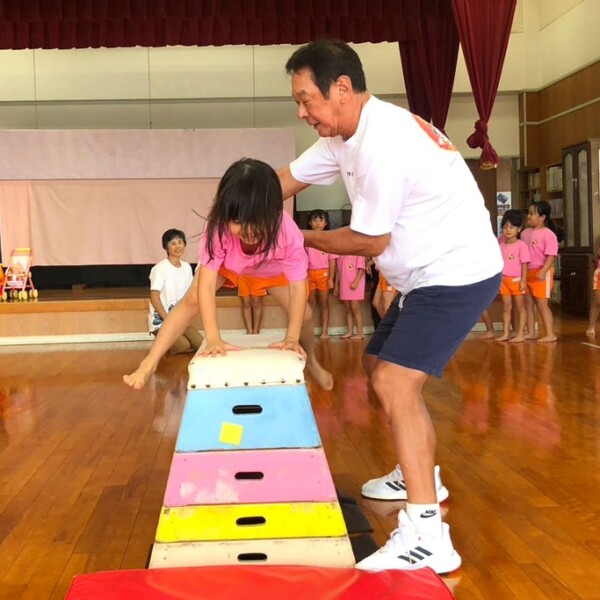 あけぼの保育園(下地聖子園長)は16日、園内多目的ホールで元オリンピック体操金メダリストの森末慎二さんを講師に招き、さくら組5歳児14人を対象に跳び箱の特別指導を行った。