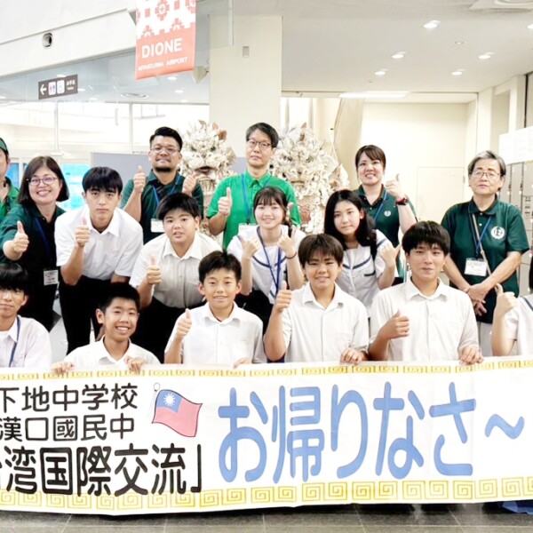 14日から19日まで台湾・台中市の漢口国民中学を訪問し、国際交流を行った下地中学校の生徒らが19日、宮古空港に降り立ち、解団式が開かれた。