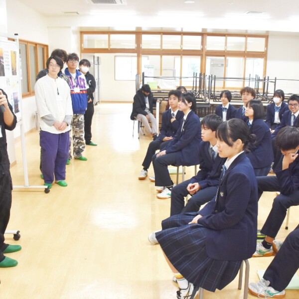 城東中学校(新崎慶校長)2年生の生徒たちが13日、高塚医療大学宮古島キャンパスで学ぶ中国、モンゴル、パキスタン、カンボジア、ネパール、バングラデシュの1年生の学生らとの交流授業を行った。