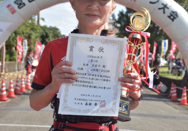 100キロ女子の部は高井美奈子さん(59)=千葉県=が2年ぶり3度目の優勝を果たした。レースは「暑さと橋の向かい風がきつかった。辛くてふらふらだったがなんとかゴールすることができた」と振り返り、3度目の優勝には笑顔を見せた。