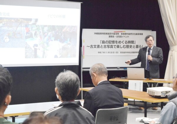 多良間村の自然文化を次代へつなぐ取り組みとして、島に残る古文書と古写真を手がかりに歴史を読み解く「島の記憶をめぐる時間」(同村教育委員会主催)が11月30日、市未来創造センターで開かれた。