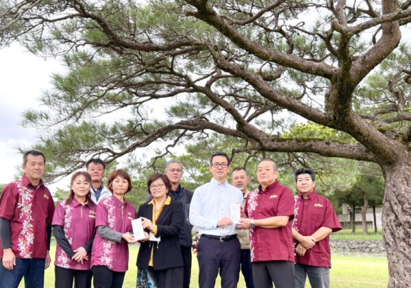 山鹿市宮古島交流推進協議会の立山和宏会長らは2日、市役所に嘉数登市長と宮城克典教育長を訪ね、新米「もりのくまさん」320㌔を宮古島市の子どもたちの学校給食へ寄贈した。