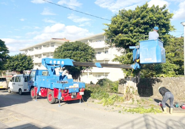 千代田開発(与那覇一輝代表)と広栄開発(仲村智幸社長)は9日、地域貢献活動の一環として県営久貝団地周辺の清掃およびガジュマルの木の剪定作業を行った。