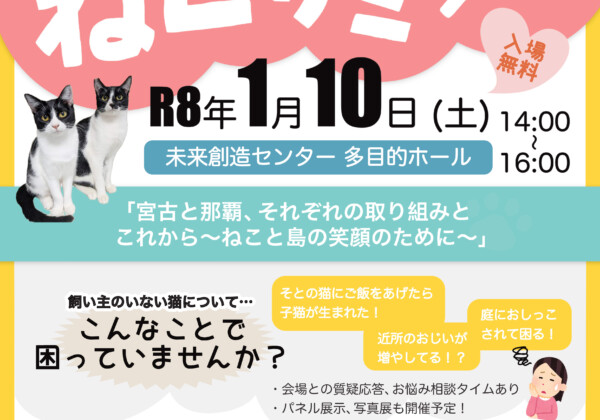 飼い主のいない猫の問題を地域全体で考えるシンポジウム「みゃーくねこサミット」が10日、市未来創造センター内の多目的ホールで午後2時から開かれる。