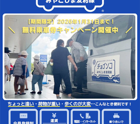 宮古島市は、デマンド交通「チョイソコみやこじま友利線」の利用促進を目的に、無料乗車券を進呈するキャンペーンを実施している。