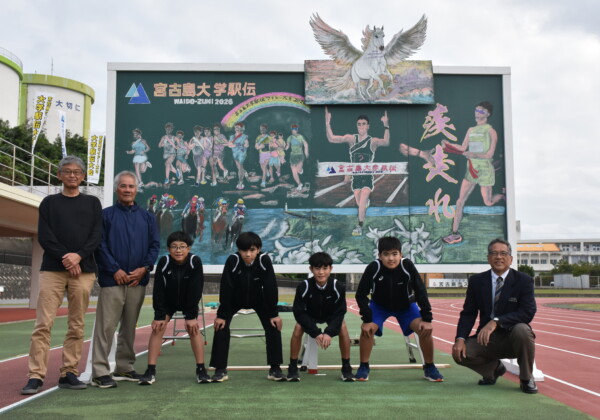 宮古島大学駅伝WAIDO=ZUMI2026「歓迎 黒板アートオープニングセレモニー」が4日、市陸上競技場で行われた。出場の選手...