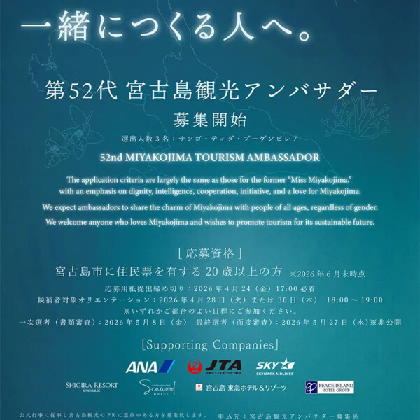 一般社団法人宮古島観光協会は、宮古島観光のPRを担う「第52代宮古島観光アンバサダー」の募集を開始した。選出される3人は「サン...