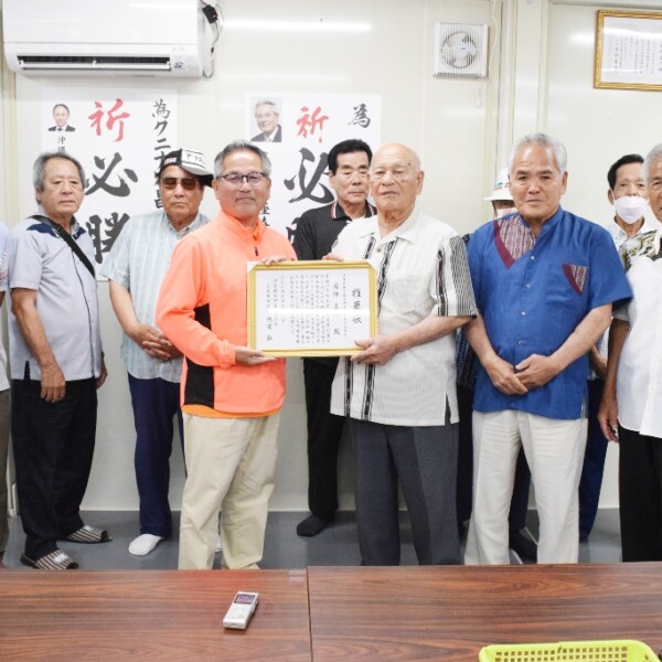 伊良部島郷友有志の会(池間弘会長)が11日、県議会議員選挙に出馬表明している國仲昌二氏(63)に推薦状を交付した。