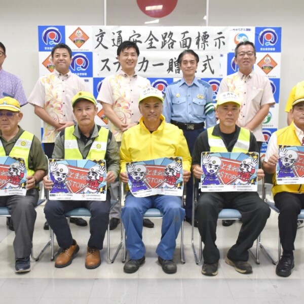 あいおいニッセイ同和損害保険沖縄支店、日本生命保険相互那覇支社が12日、宮古島警察署と宮古島地区交通安全協会に「交通安全の路面標示ステッカー」を贈った。