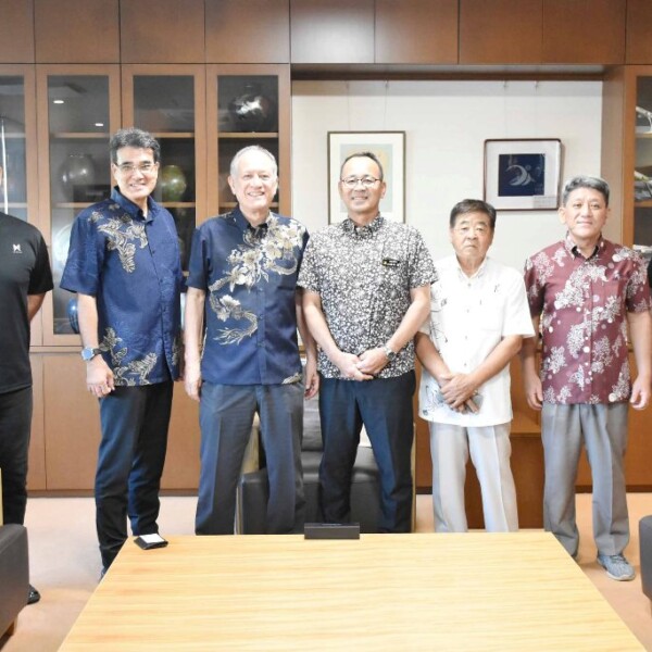 沖縄県バスケットボール協会の日越延利会長、下地秀隆副会長が23日、市役所に砂川朗副市長を訪問した。