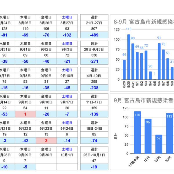沖縄県は28日、宮古島市在住の新型コロナ感染者9人を確認したと発表。入院療養者は4人(中等症2人、軽症2人)。県での直近1週間...