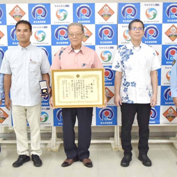 長年にわたり地域の少年補導活動に尽力してきた下地與那覇出身の池村英三さん(69)が2025年度「少年補導栄誉金章」を受章し、22日に宮古島警察署で受章報告会が開かれた。