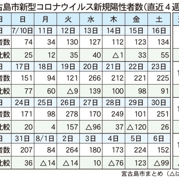 県は6日、宮古島市で新たに152人の新型コロナウイルス感染者が確認されたと発表した。7月31日週の合計は1284人となり、3週...