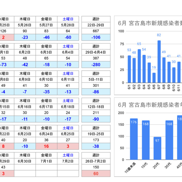 沖縄県は29日、宮古島市在住者で新型コロナ感染者43人を確認したと発表。入院療養者は2人(中等症、軽症1人)。市での直近1週間...