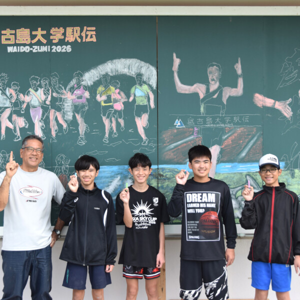 2月8日に開催される「宮古島大学駅伝ワイドー・ズミ2026」を前に、出場選手らを歓迎する黒板アート制作が31日、市陸上競技場で...