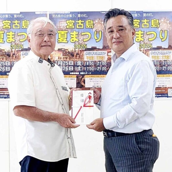 25と26両日に開催される宮古島夏まつり2025に役立ててほしいと宮古テレビの上地克幸代表取締役と県建設業協会宮古支部の友利勝人支部長は16日、宮古島商工会議所に同まつり実行委員会会長の根路銘康文会頭を訪ね、協賛金を手渡した。