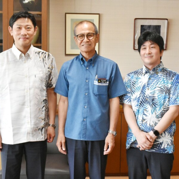 北海道室蘭市の青山剛市長らが27日、市役所に嘉数登市長を訪問した。両市は英国探検船「プロビデンス号」が寄港した縁で歴史的な繋がりと「海と船のロマンが結ぶ交流都市」として交流都市締結をしており、子どもらの交流などを行っている
