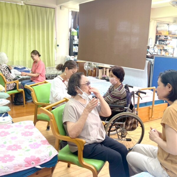 宮古ヒーリングハンズプロジェクトのメンバーらは19日、平良島尻にあるデイサービス「んーながうまりさとぅ」を訪れ、利用者にアロマタッチケアを行った。