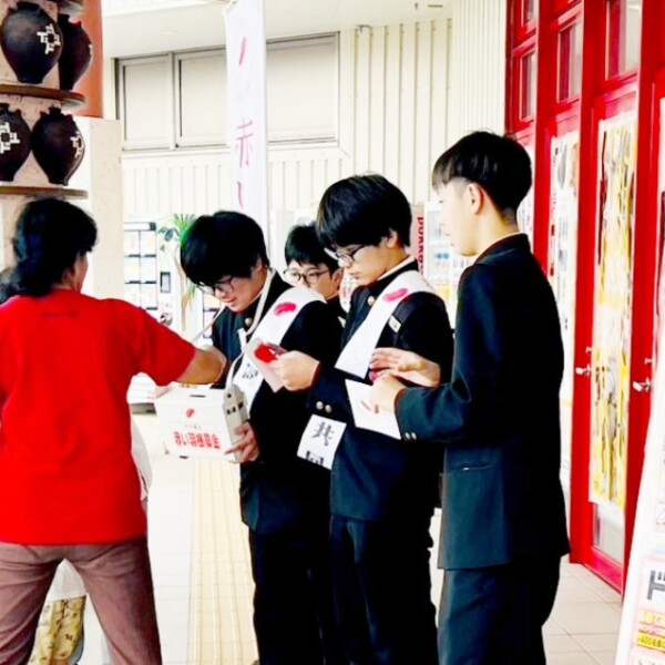 鏡原中学校の生徒らはこのほど、ドン・キホーテ宮古島店前で赤い羽根共同募金の街頭募金活動を行った。