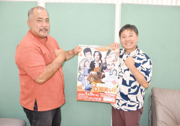 沖縄お笑い団体FECオフィス代表の山城智二さんらが10月29日、宮古新報社を訪れ、来年1月9日にマティダ市民劇場で開催する「新春初笑い」の公演をPRした。