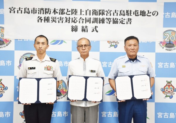 「宮古島市消防本部と陸上自衛隊宮古島駐屯地との各種災害対応合同訓練等に関する協定書締結式」が31日、市役所で行われた。