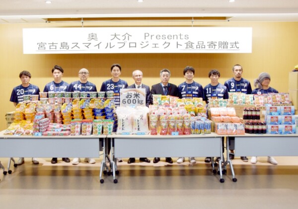 サッカー元日本代表らが参加する「奥大介プレゼンツスマイルプロジェクト」によるフードバンクんまんまへの寄贈式が12日、市役所で行われ、名波浩氏をはじめ福西崇史氏、久保竜彦氏、小野伸二氏らそうそうたるメンバーが、約100万円相当の商品券と食料品を市社会福祉協議会へ贈った。