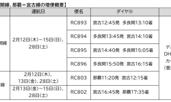 琉球エア―コミュ―タ―(RAC、山田賢哉社長)は26日、2月の宮古―多良間線および那覇―宮古線において定期増便を行うと発表した。多良間線では1月、搭乗回数を稼ぐ目的の「修行僧」と呼ばれる乗客が急増し、50席のうち島民の利用が15席に留まるなど生活路線としての機能が危ぶまれる事態となっていた。