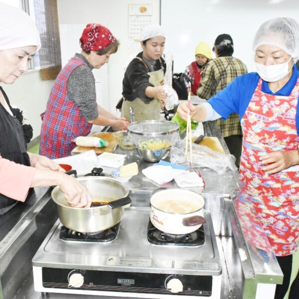 宮古島スローフード研究会(津嘉山千代代表)は21日、ゆいみなぁ(市働く女性の家)で煮込みうどん、ゴーヤーの佃煮、りんごと白菜の白和え、スイートポテトサラダを作った。