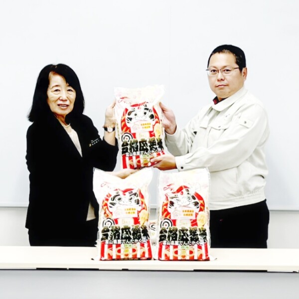 沖食グループ株式会社南西沖食は5日、市役所を訪れ、市教育課を通じて、宮古島の受験生に合格祈願米5㌔を贈呈した。