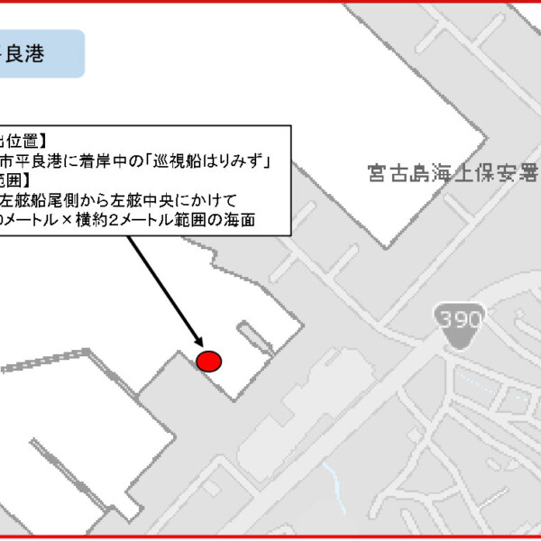 宮古島海上保安部は6日、 平良港で着岸している巡視船 「はりみず」 (長さ56㍍、 総㌧数335㌧) が同日午前9時ごろに漏油を起こしたと発表した。