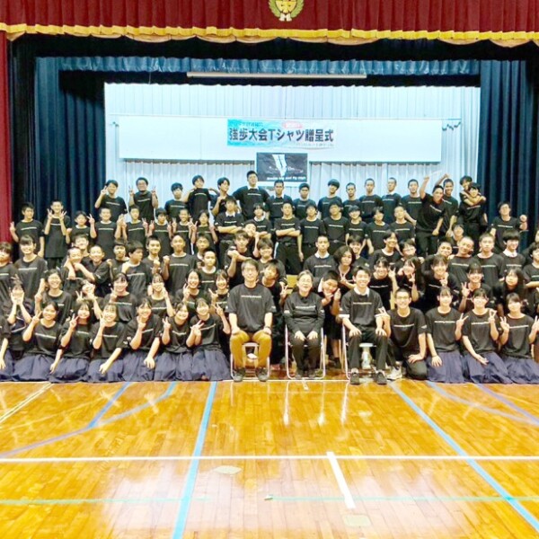 22日に開催される下地中学校の恒例行事の強歩大会に向け、中流文化経済協会と琉球華橋總會宮古支部は4日、同校を訪れ、全校生徒へTシャツの贈呈式を行った。
