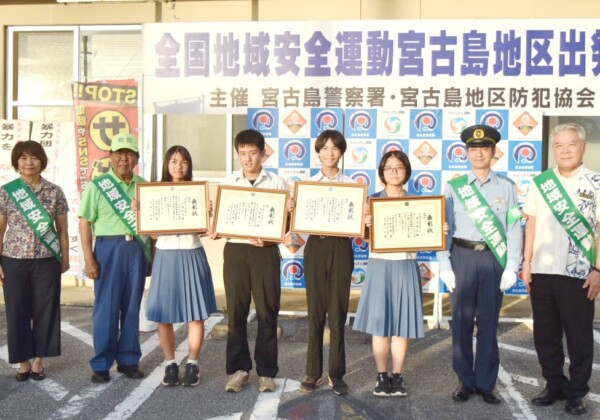 全国地域安全運動(11~20日)の宮古島地区出発式が宮古島警察署駐車場で行われた8日、全国地域安全運動ポスターの部・全国暴力追放運動用標語の部宮古島地区入賞者表彰と、ちゅらうちなー安全なまちづくり功労者の表彰が行われた。