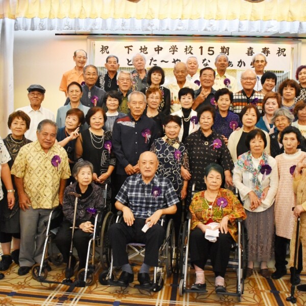 【那覇支局】ことし77歳を迎える下地中15期生の喜寿祝いが20日、那覇市のマリエールオークパインで開かれ、沖縄本島各地や宮古島、八重山や日本本土から43人が集まり、互いの長寿や健康を願うとともに旧交を温め、昔話や思い出話に花を咲かせた。