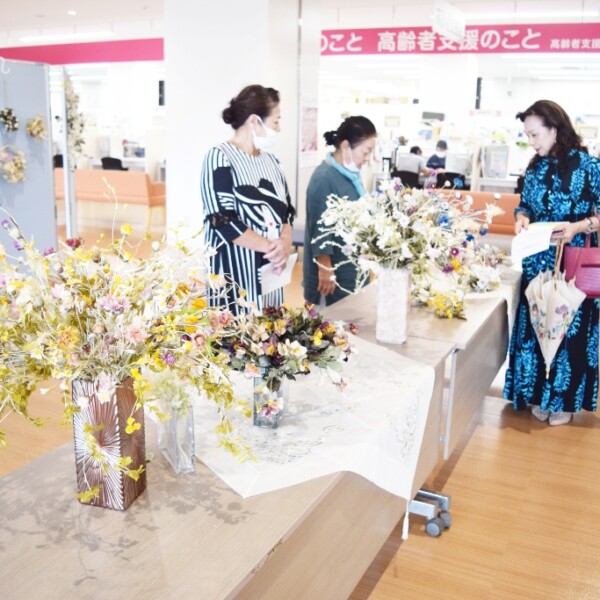 大湾明美さん(旧姓・仲地 那覇市)と仲地道子さん(92 伊良部佐和田)の「布花親子展」が、15日から市役所1階の高齢者支援課前のロビーで行われている。