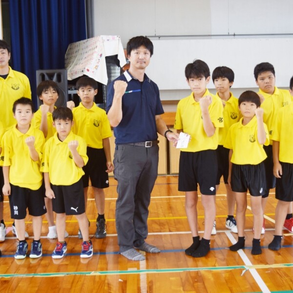 「第39回全九州小学生バレーボール優勝大会inSAGA」に出場する砂川イエローユナイトの選手らに26日、安藤ハザマ・大城組建設共同企業体、先嶋建設、南成土木、古波蔵組から寄付金の贈呈があった。