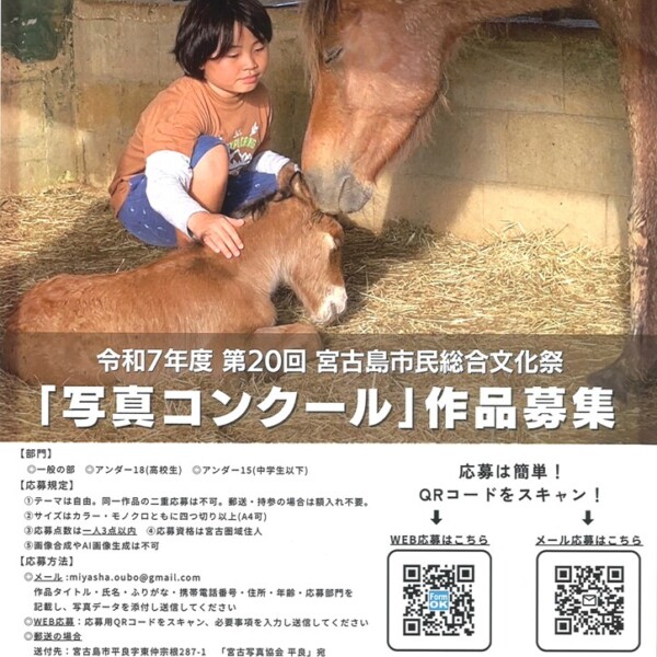 宮古島市政施行20周年記念事業の一環として10月10~12日まで市未来創造センターで開かれる第20回宮古島市市民総合文化祭の写真部会では会員が一年を通じて撮影した作品のほか、市民から応募された写真も展示する予定で、21日まで出品作品を受け付けている。