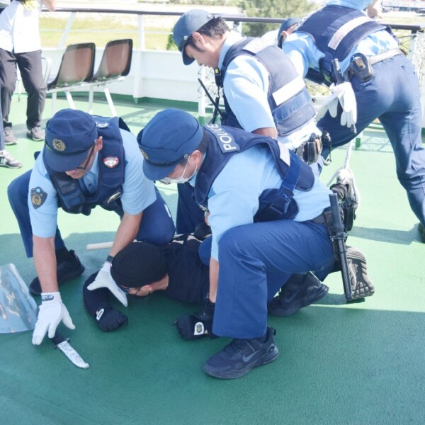 宮古島警察署(新垣健一郎署長)は17日、はやてのクルーズ船「モンブラン」でテロを想定した訓練を行った。