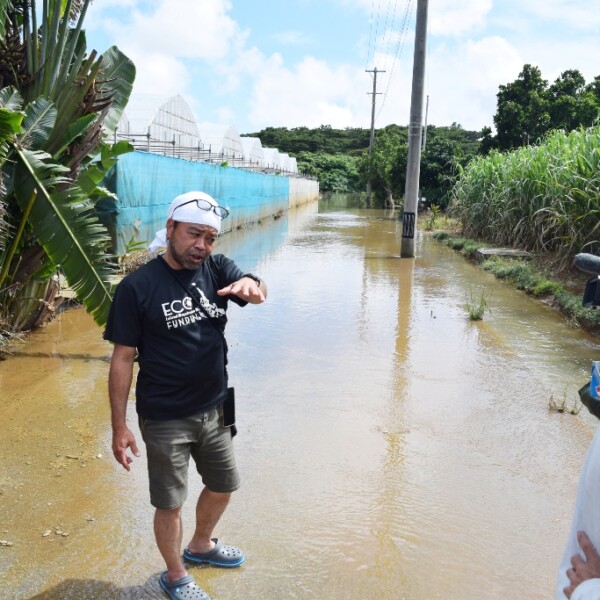 宮古島市区選出の下地康教県議が24日、大雨により冠水被害を受けたマンゴー農園を視察し、被害状況を確認した。