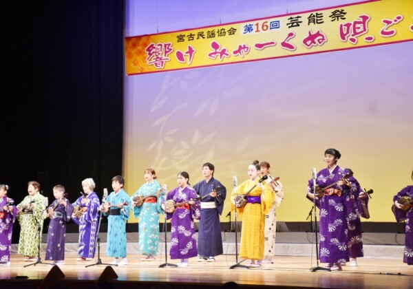 宮古民謡協会(渡久山吉彦会長)は26日、マティダ市民劇場で第16回芸能祭「響け みゃーくぬ唄ごごろ」を開催した。