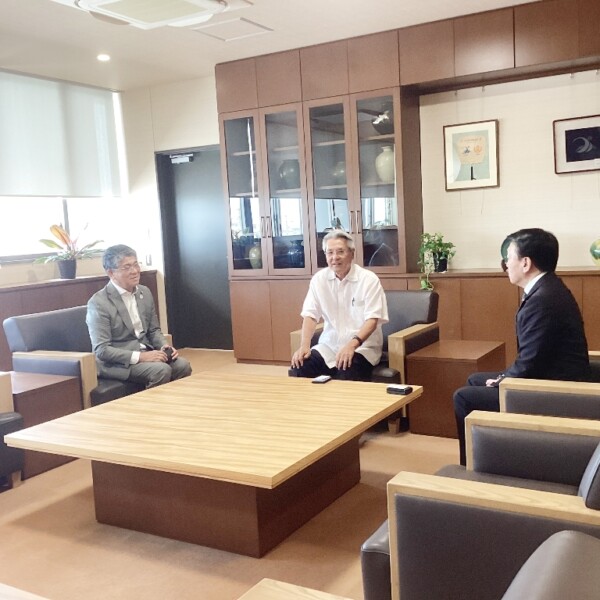宮古島で10年ぶりの開催となった防衛省全国情報施設協議会役員会が行われた10日、福留成人会長(宮崎県串間市議会議長)と岡本雄輔相談役(北海道稚内市議会議長)は午前11時に市役所で座喜味一幸市長を表敬し意見を交わした。