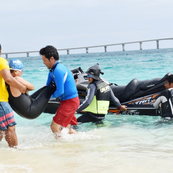 4月14日に開催される全日本トライアスロン宮古島大会に向けての水泳部レスキュー訓練が28日、下地与那覇の前浜ビーチで実施された。